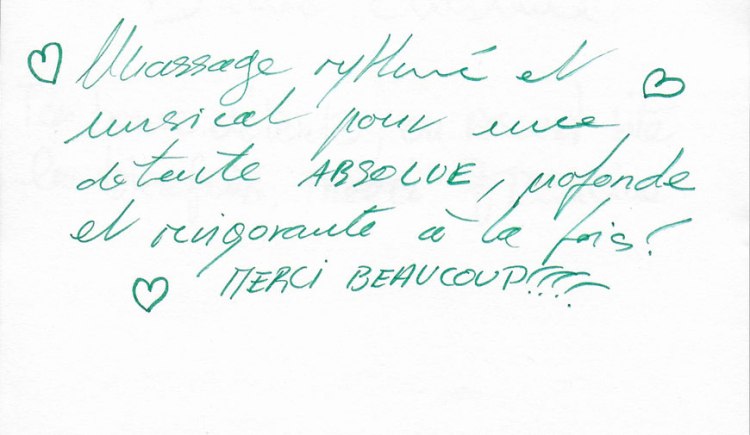 « Coucou à toi, quelques lettres qui se mettent à danser et à se regrouper pour former mots et phrases qui te diront mes états d’être pendant et après ton « massage »: