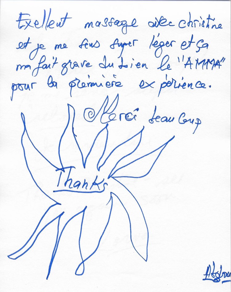 Si il y a une masseuse à conseiller sur Paris c’est bien elle ! Toujours souriante, hyper professionnelle à tous points de vue, Christine n’a pas hésité à dépasser l’horaire prévu pour finir comme il se devait ce massage qui m’a permis, enfin !, d’enlever toutes les contractures et douleurs que je me traînais depuis un bon bout de temps..Alors je me permets d’écrire ce petit mot pour vous encourager à aller la voir, vraiment, vous ne serez pas déçu(e)s et en ressortirez encore plus vivants. Parole d’infatigable qui a du mal à savoir s’arrêter; il faut savoir prendre soin de soi pour mieux avancer ensuite ! (table chauffante, madeleine et thé en dessert, ambiance générale vraiment agréable : que demander de plus ?!) Merci Christine Merli ! Foncez y ! — merveilleusement bien. Aloïse, Circassienne (2 mai 2016)